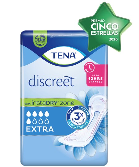 La compresa para la incontinencia TENA Discreet Extra ofrece máxima protección, por eso es ideal para las pérdidas de orina moderadas imprevistas. La tecnología InstaDRY™ Zone absorbe el líquido al instante y lo aleja de la piel, garantizando una sensación de sequedad de hasta 12 horas. Con triple protección antes las pérdidas, el olor y la humedad, TENA Discreet Extra es la mejor opción diaria para las mujeres que sufren pérdidas de orina moderadas. Esta suave compresa para la incontinencia es muy cómoda gracias a los laterales elásticos que se adaptan perfectamente a la forma del cuerpo. La absorción instantánea y el cómodo ajuste harán que te sientas segura durante esos escapes de orina que pueden ser tan inoportunos.